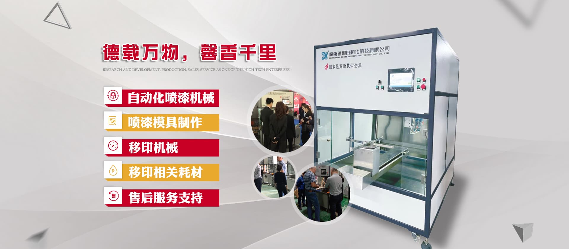 德馨科技創(chuàng)立以來,以改變噴印業(yè)傳統(tǒng)手工生產(chǎn)模式為目標(biāo),產(chǎn)品開發(fā)制造堅(jiān)持以“環(huán)保、智能”為理念,為企業(yè)的生產(chǎn)環(huán)境、人力成本、生產(chǎn)效率等提供更為優(yōu)良的服務(wù)和技術(shù)支持。公司研發(fā)產(chǎn)品主要有自動(dòng)化噴漆機(jī)械、噴漆模具制作等;生產(chǎn)銷售移印機(jī)械及移印相關(guān)耗材,包括菲林設(shè)計(jì)輸出;鋼板制作、移印膠頭制作、定位制作及周邊配件耗材并提供完善的售后服務(wù)支持。